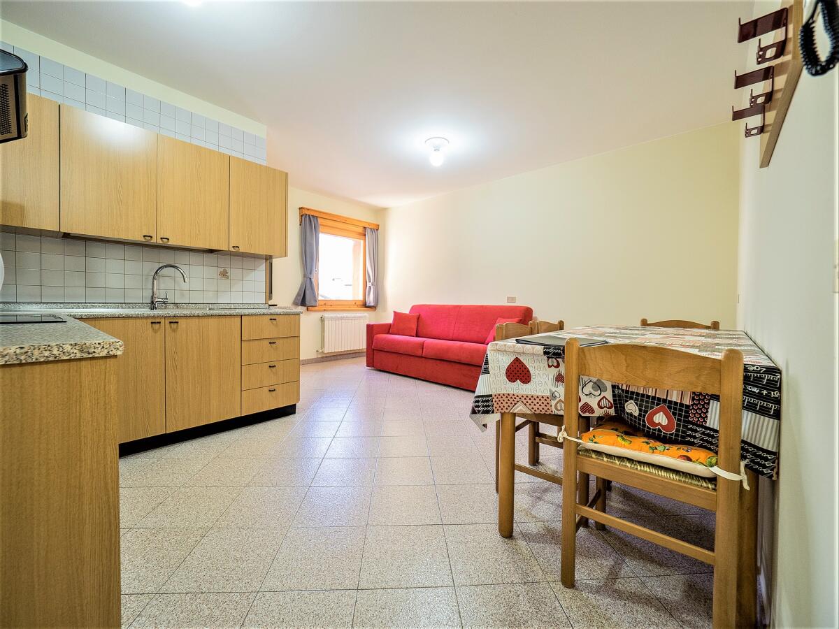 Un soggiorno con divano letto, TV satellitare e cucina abitabile