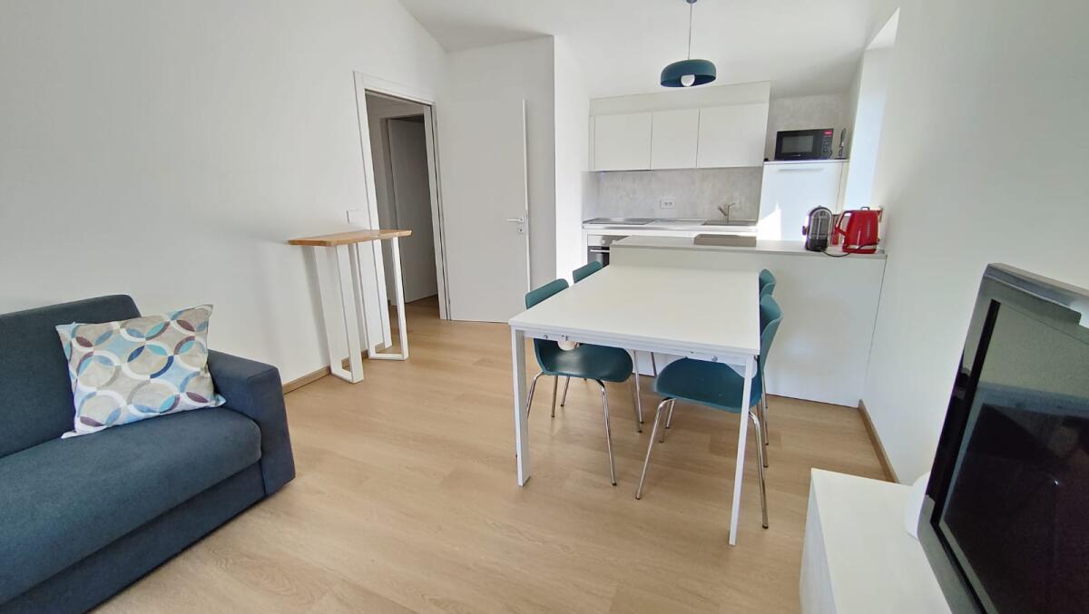 Cucina-soggiorno con divano letto matrimoniale, tavolo da pranzo e cucina attrezzata