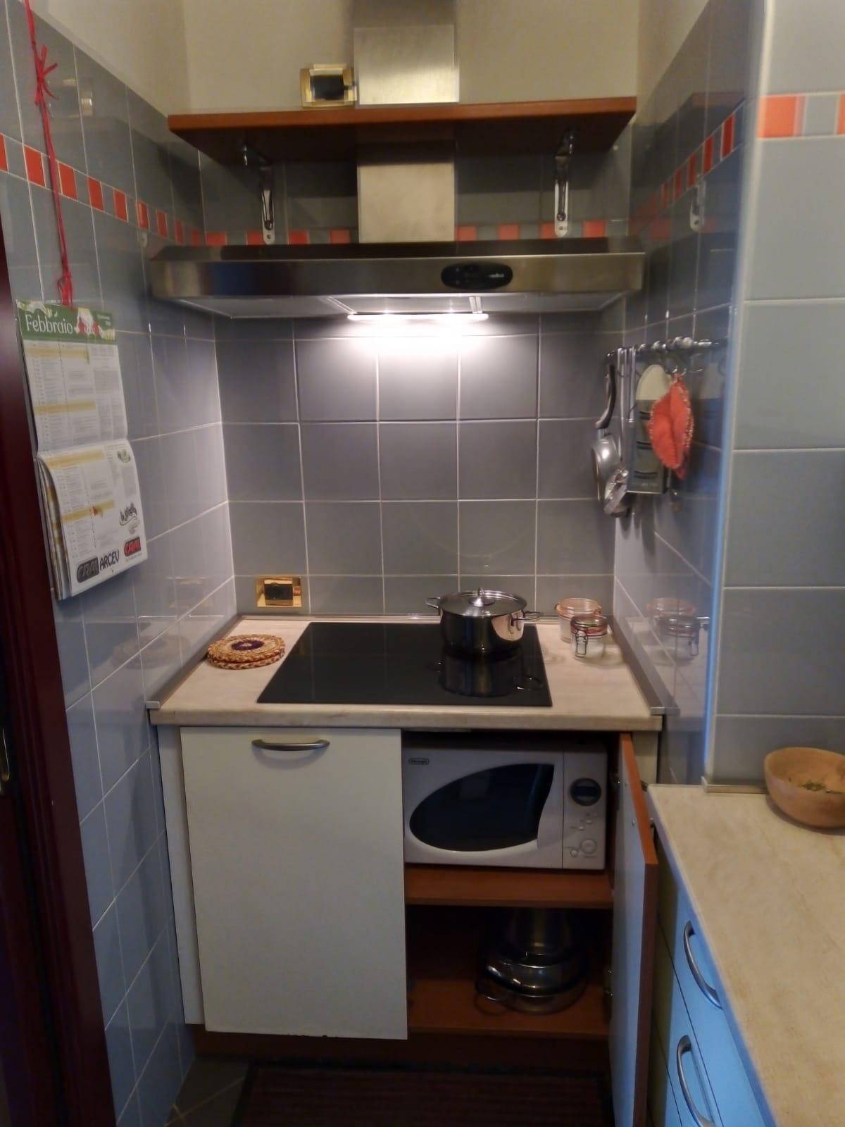 ingresso, bagno spazioso, antibagno con ampia doccia, camera con letto matrimoniale, sala pranzo/ soggiorno con TV ed una splendida vista, e l' annesso cucinotto, dotato di piano ad induzione -e fornetto a microonde; è accessoriato di stoviglie, posateria, batteria di pentole per induzione, dotazione per la pulizia.