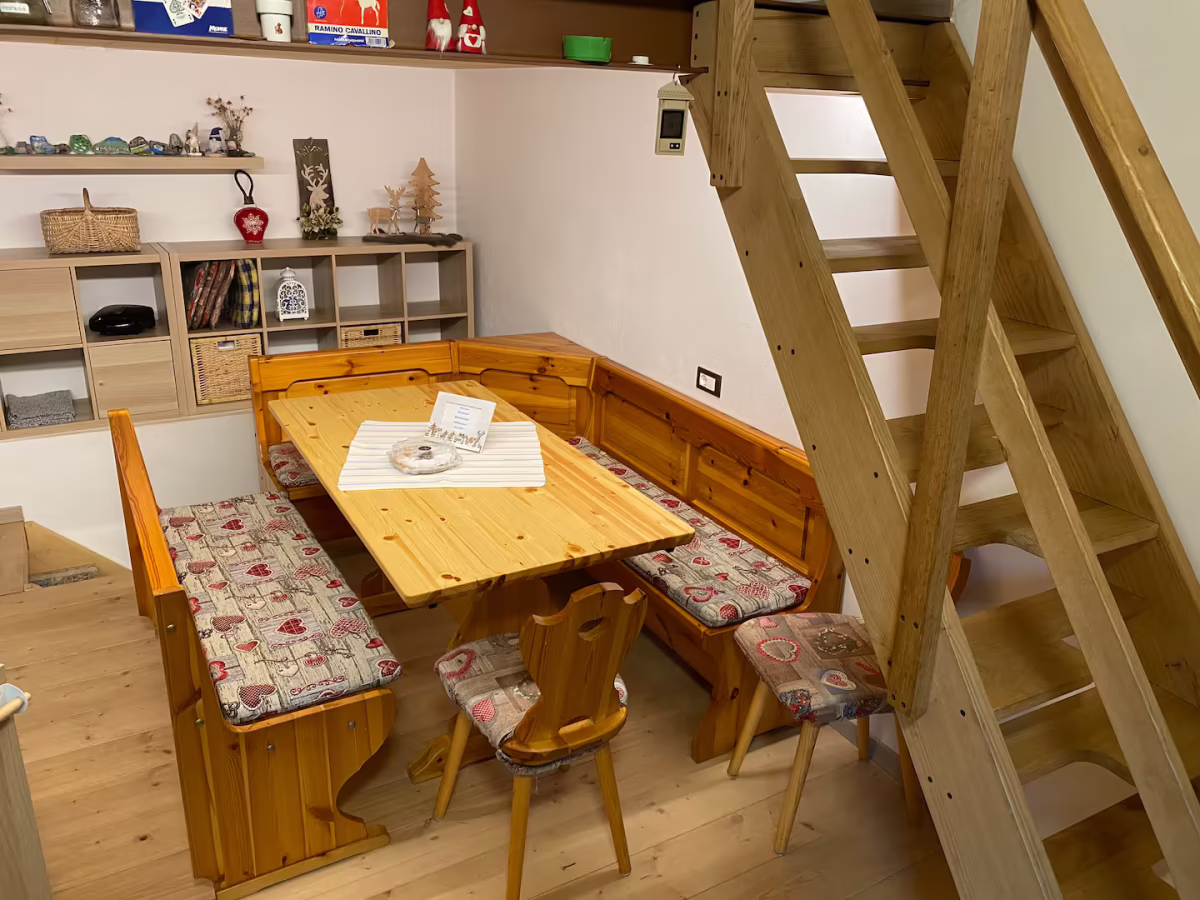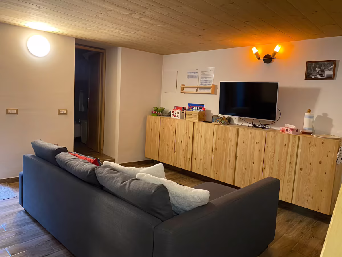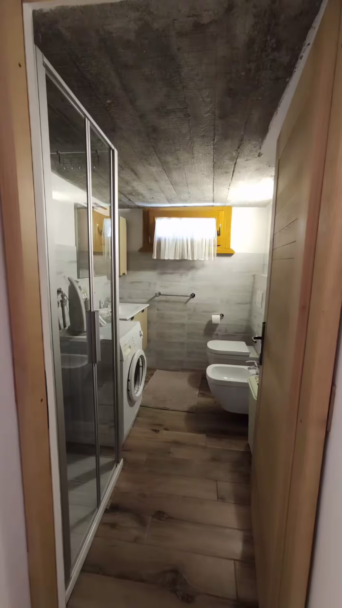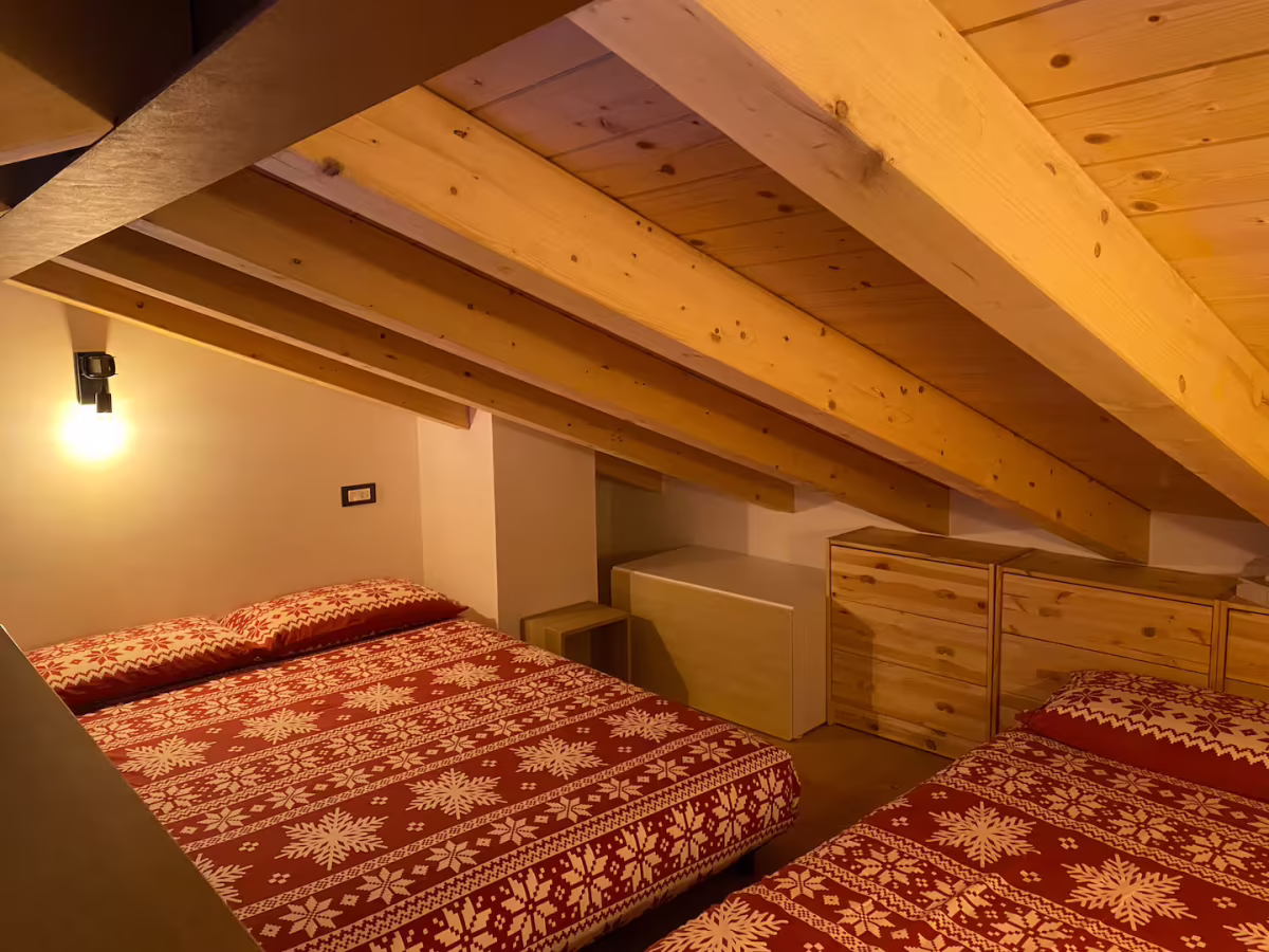 Baita disposta su tre piani oltre alla terrazza e all’area esterna (cortile).Piano terra composto da bagno completo e taverna/salotto con TV, armadi, stufa economica (cucina a legna) e divano letto (è predisposto per sdraiarsi comodi davanti alla tv o per leggere un libro, non per trascorrere la notte).