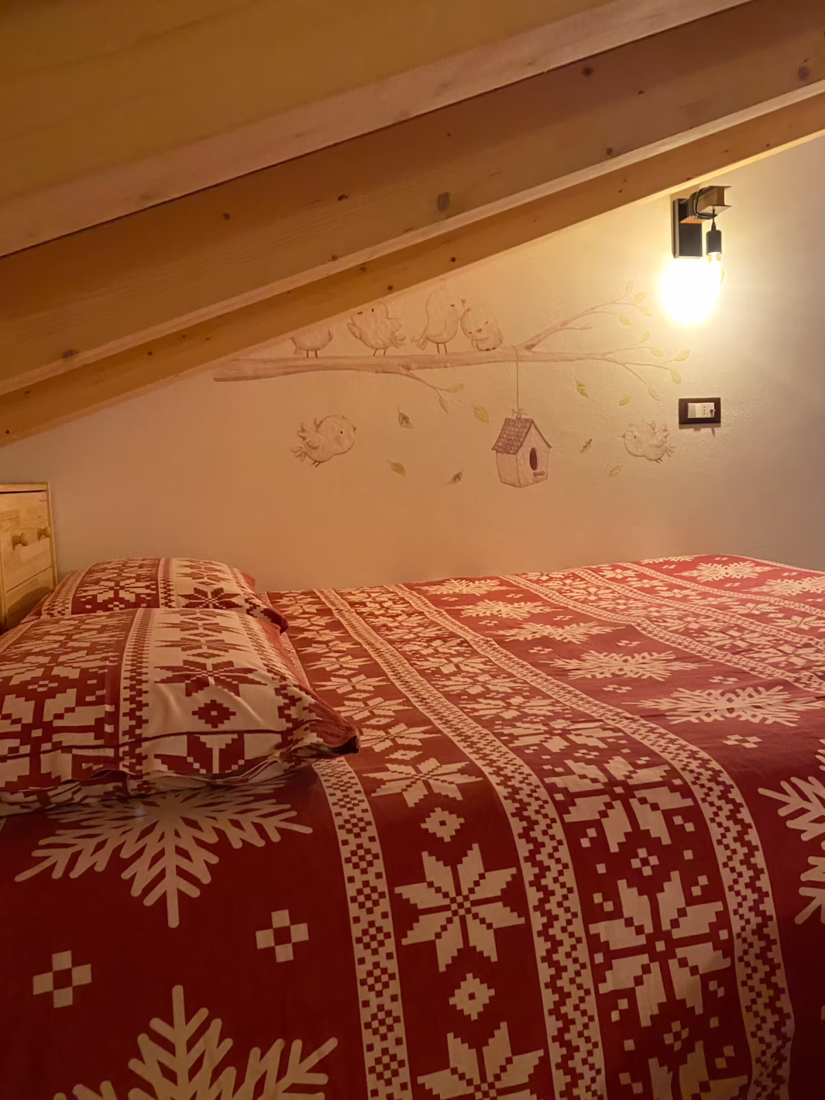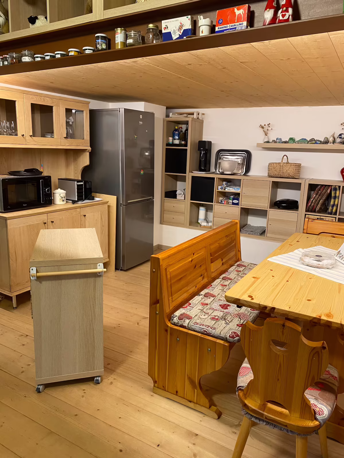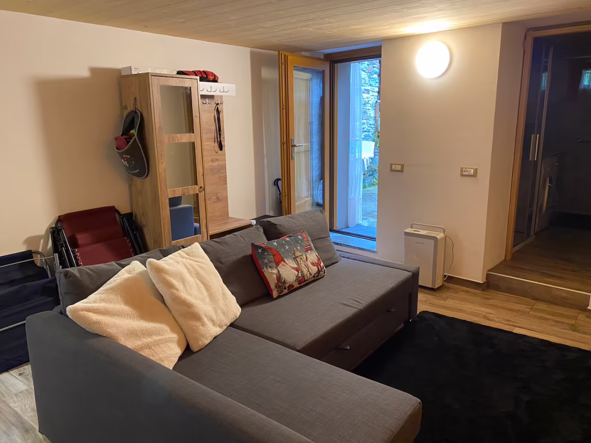 Baita disposta su tre piani oltre alla terrazza e all’area esterna (cortile).Piano terra composto da bagno completo e taverna/salotto con TV, armadi, stufa economica (cucina a legna) e divano letto (è predisposto per sdraiarsi comodi davanti alla tv o per leggere un libro, non per trascorrere la notte).