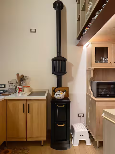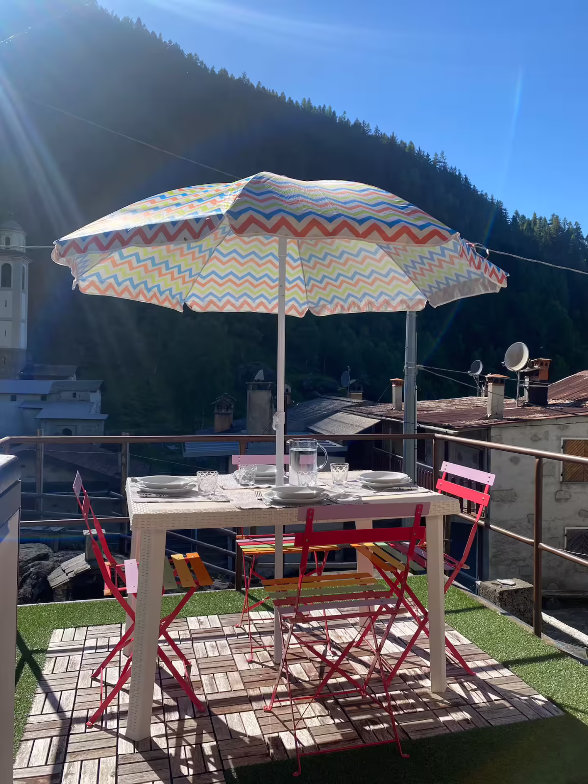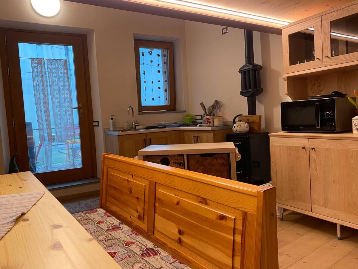 Primo piano con angolo cucina, piccola stufa a legna, credenza, tavolo da pranzo e terrazza adibita con tavolo e sedie per pranzare all'aperto.