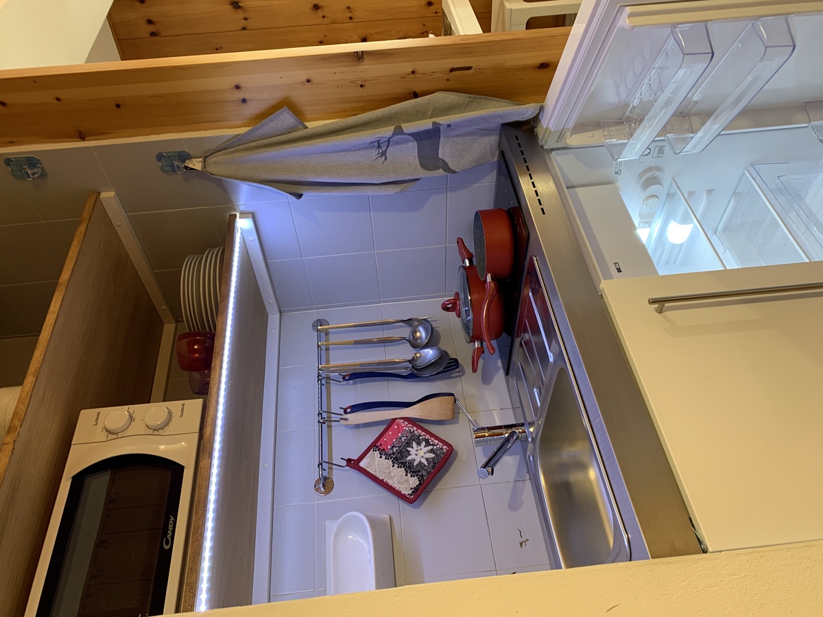 Casa Ferrè offre un soggiorno arredato da due poltroncine, tavolo da pranzo con panche e un piccolo funzionale angolo cucina, completo di fornelli a induzione, frigo, forno microonde/grill, macchinetta caffè Bialetti, bollitore e stoviglie. Estintore.